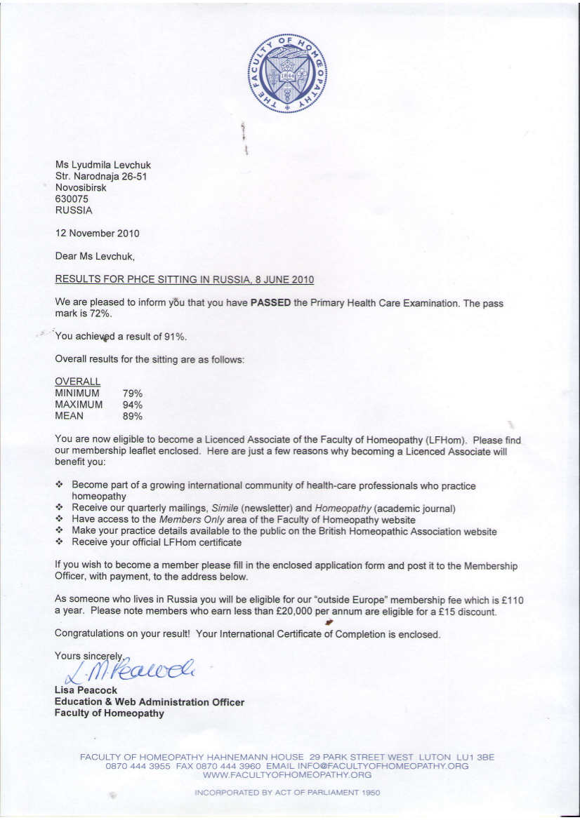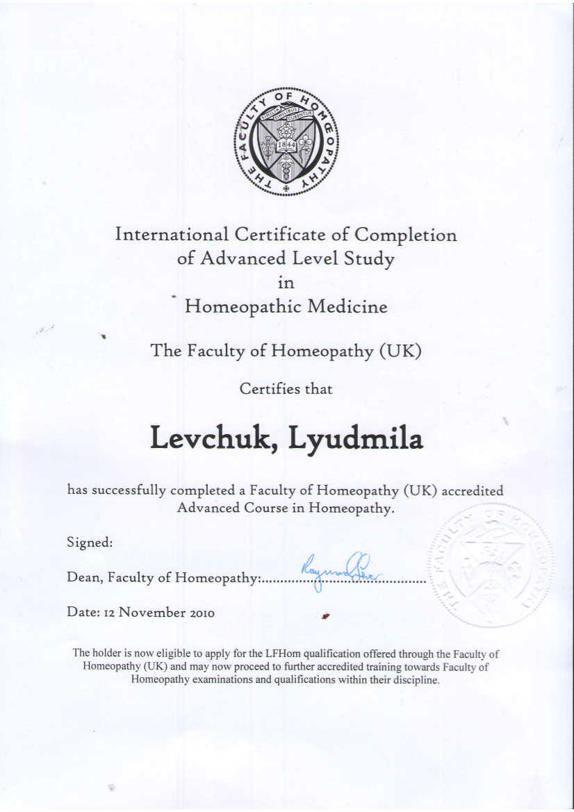 2010г – окончила школу Лондонского факультета гомеопатии.
