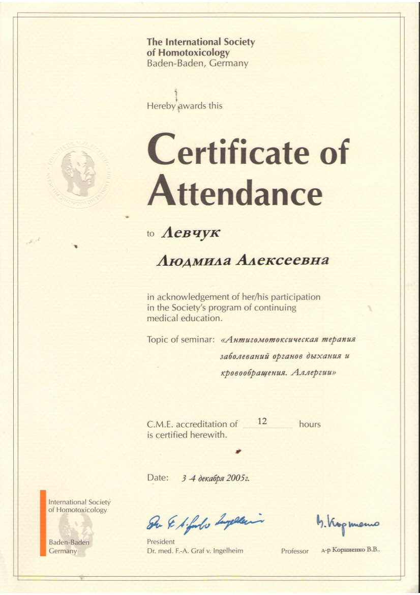 2008, 2010г – выездные семинары доктора Спиннеди (Швейцария) « Использование гомеопатии в лечении пациентов с онкологией»