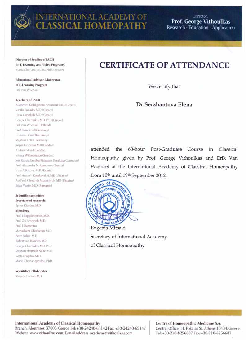 Очарованная Гомеопатией, прошла обучение в Международной академии классической гомеопатии Дж.Витулкаса (Алонисос, Греция).