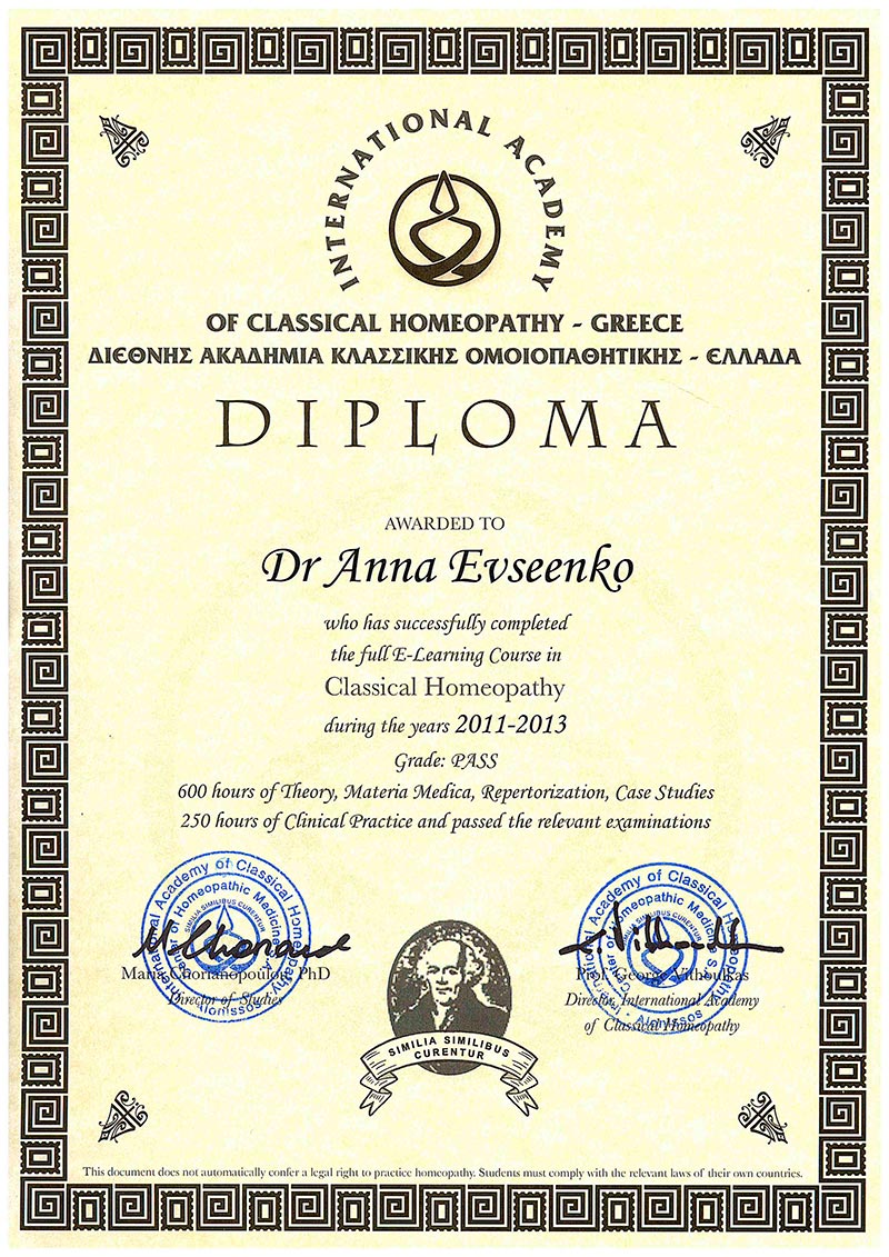 В 2013 г. закончила обучение в Международной Академии Классической Гомеопатии (Джордж Витулкас).